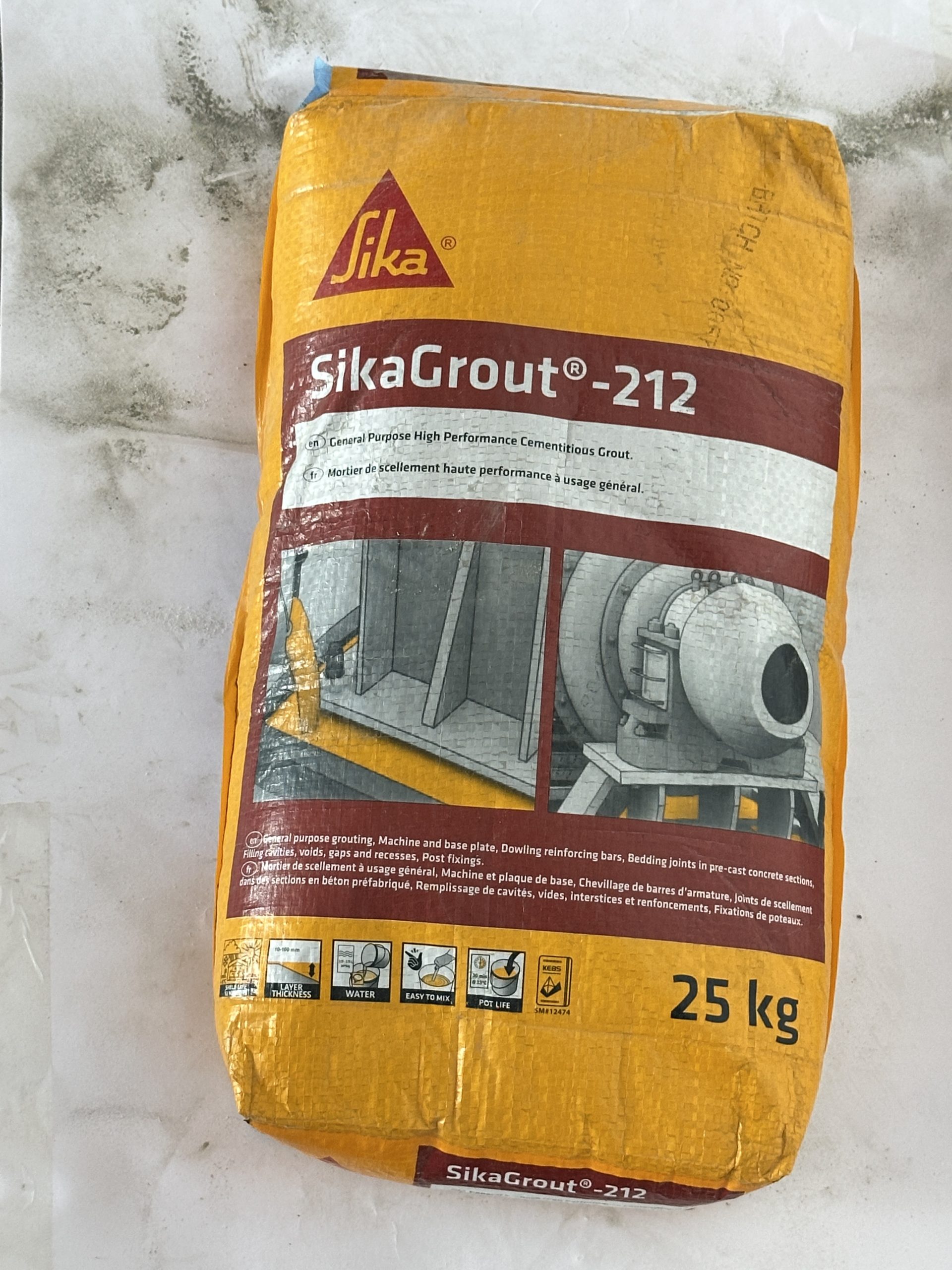 SikaGrout®-212 is a 1-component, ready to mix, free flowing, low shrinkage expanding cementitious grout. Used in General purpose grouting, Machine and base plates, Dowling reinforcing bars, Bedding joints in pre-cast concrete sections, Filling cavities, voids, gaps and recesses, Post fixings